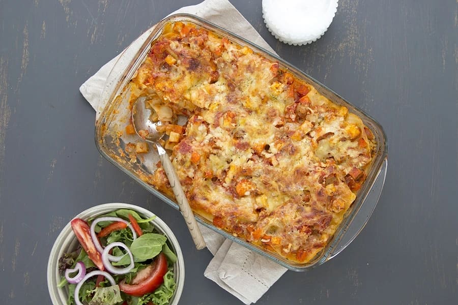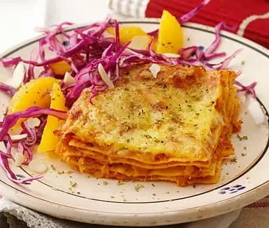 Rotfruktslasagne med knaprig rödkålssallad