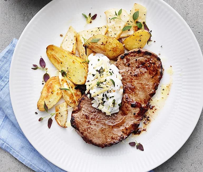 Oxfilé med srirachaglaze, ädelost och gräddstuvad rotselleri