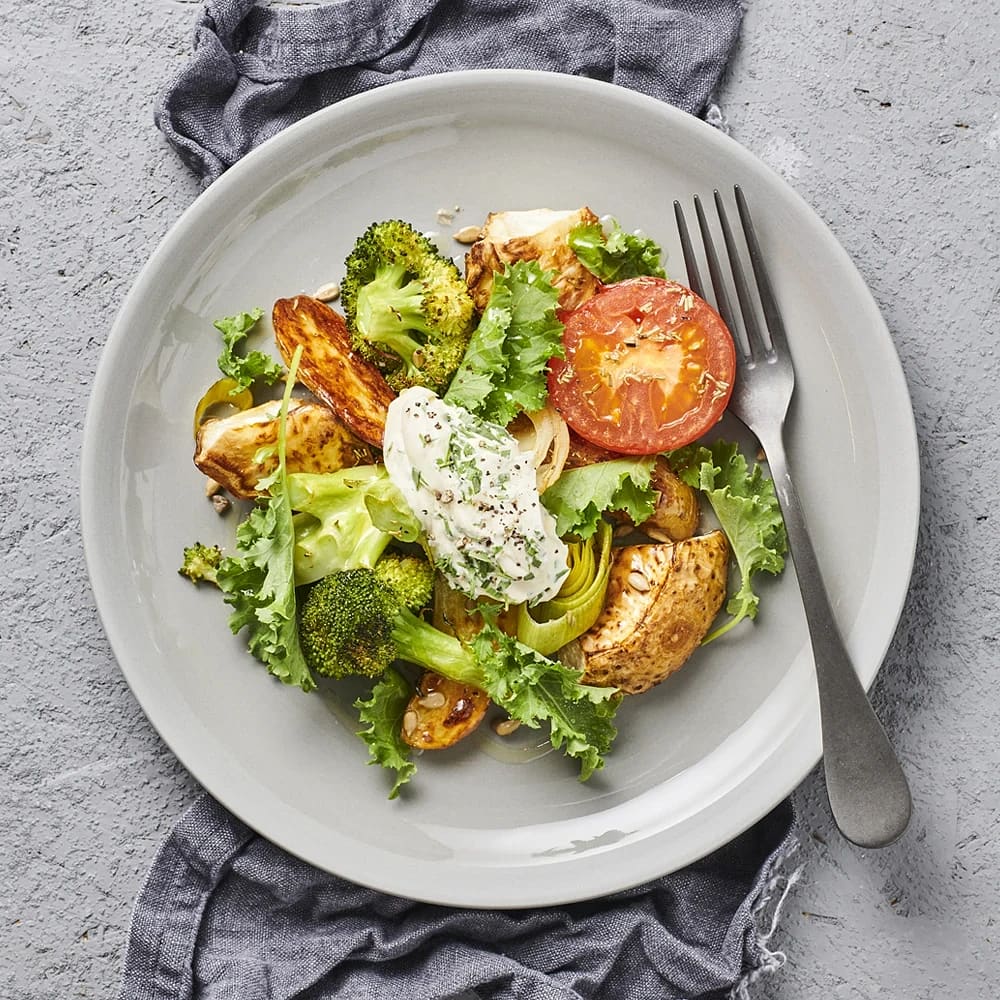 Linssallad med bakad rotselleri och dressing på soltorkade tomater