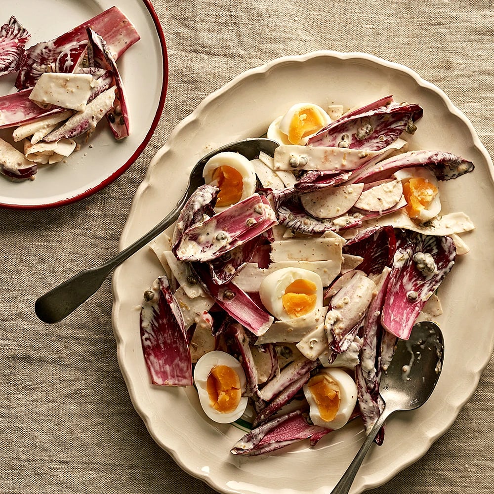 Rostad rotselleri med hasselnötsmajonnäs och ägg
