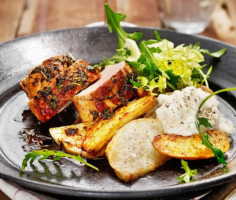 Bakad rotselleri med örtsmör, gräddkokt kål med tryffel, rostad mandel och knaperstekt fläsk