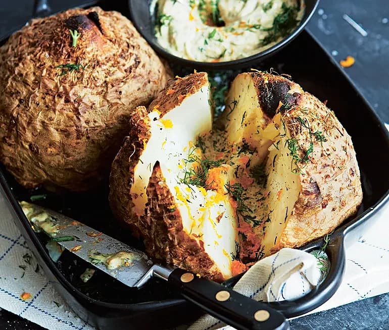 Helbakad rotselleri med ostronskivling, rostade hasselnötter och soyamajonnäs