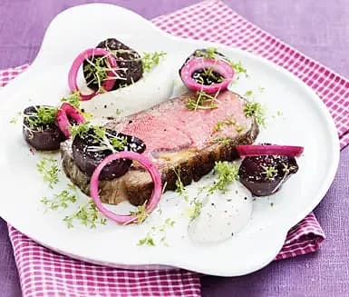 Helstekt rostas med timjan, vitlöksstekt svamp och potatis- och rotselleripuré