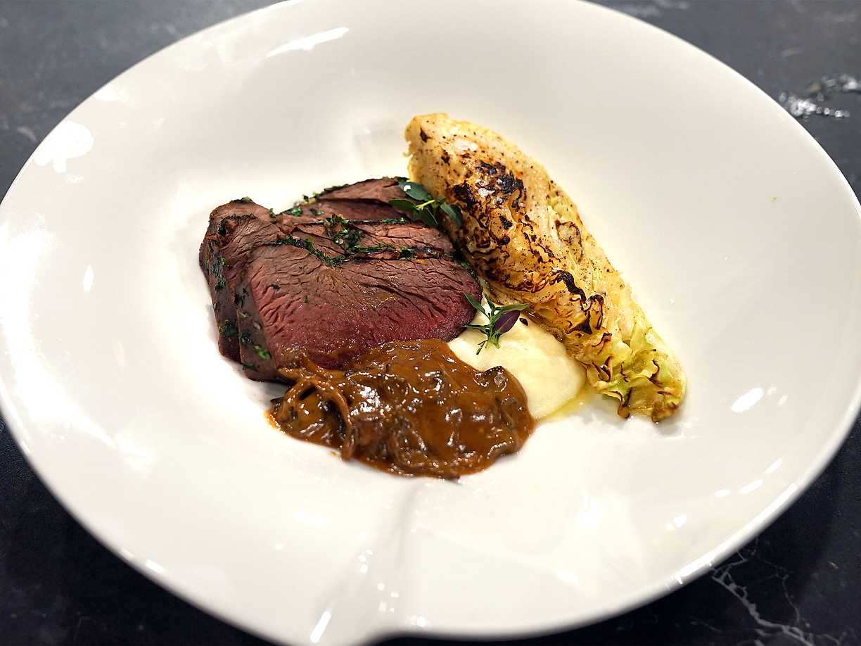 Örtrullad älgfilé med rotselleripuré och trattkantarellsås