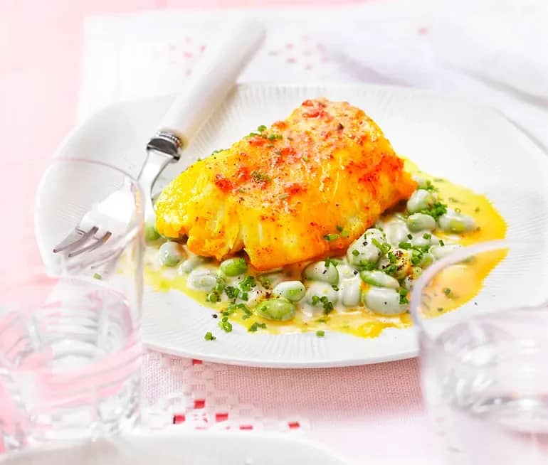 Saffranstorsk med krämiga bönor