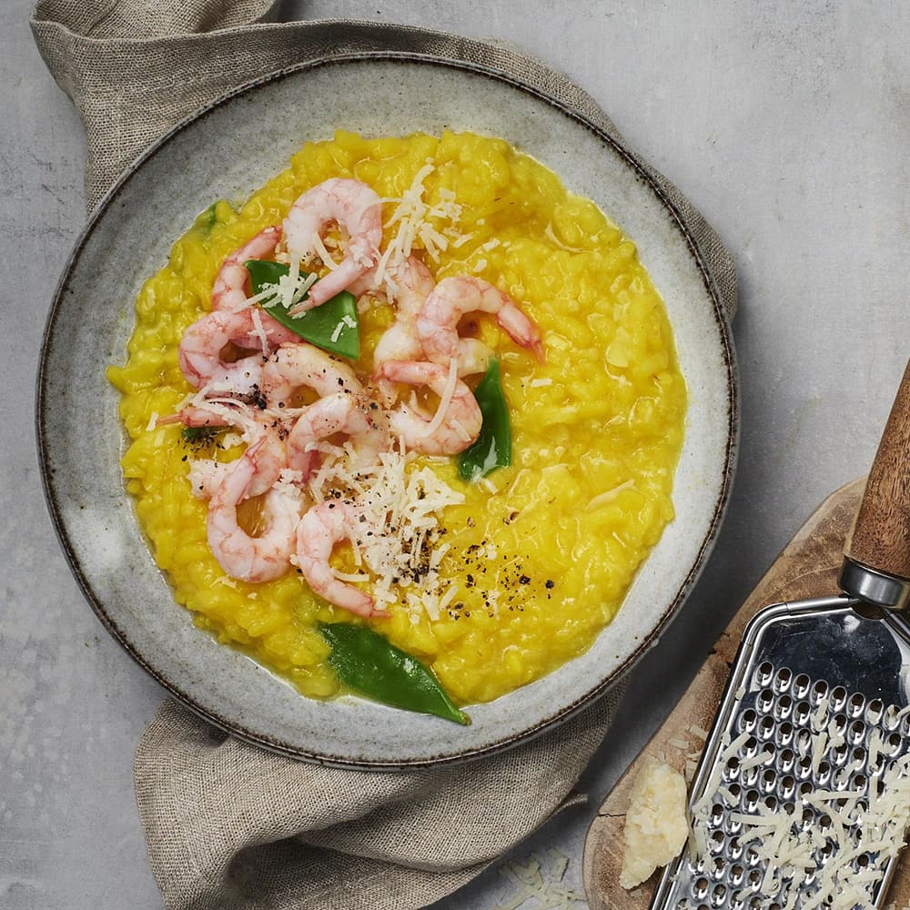 Saffransrisotto med räkor, sockerärtor och gräslök