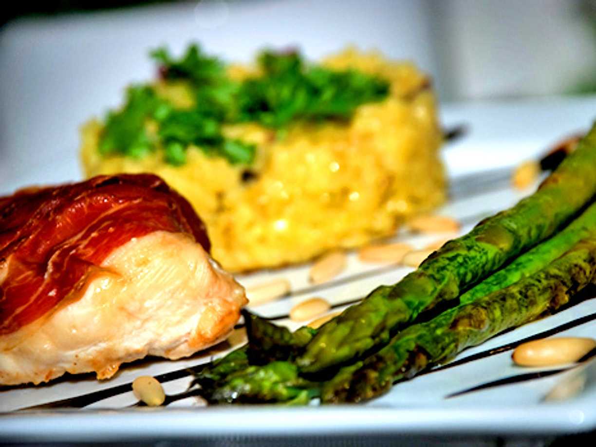 Grillad seranoinlindad kyckling med fyllning av ädelost och saffransrisotto