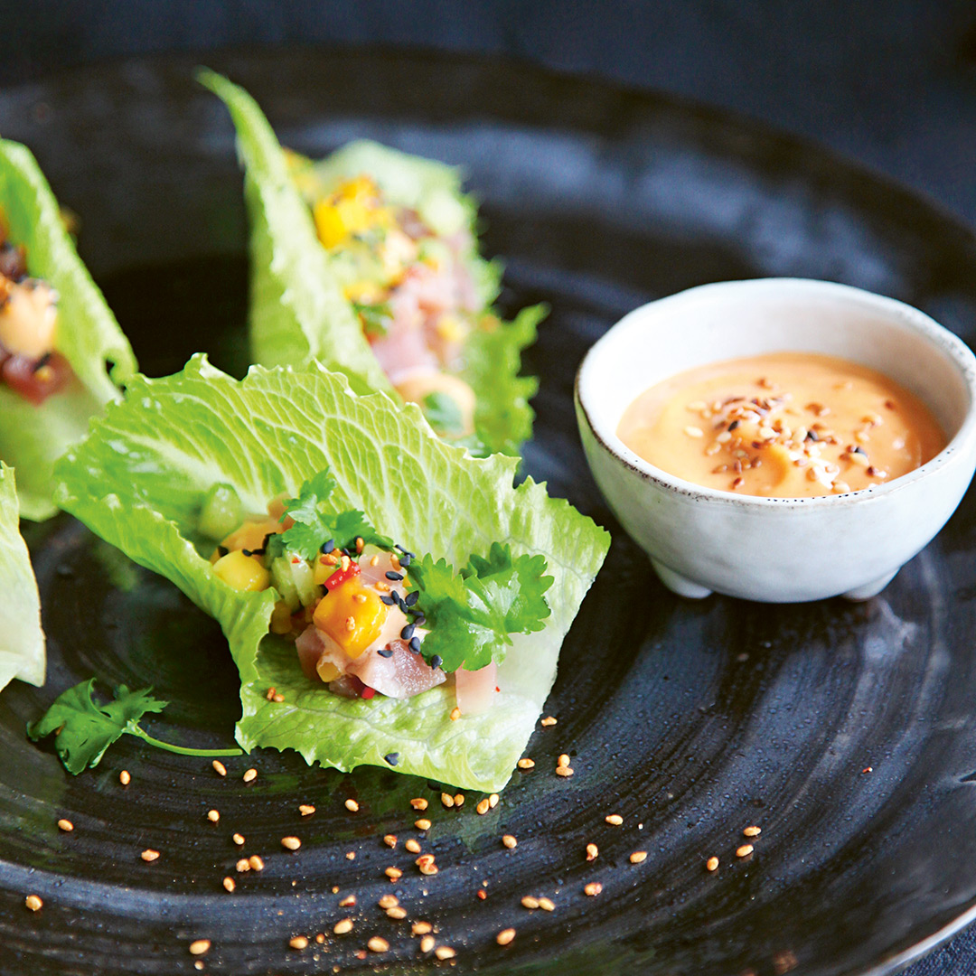Carpaccio på hälleflundra med citrussallad, chili och mynta