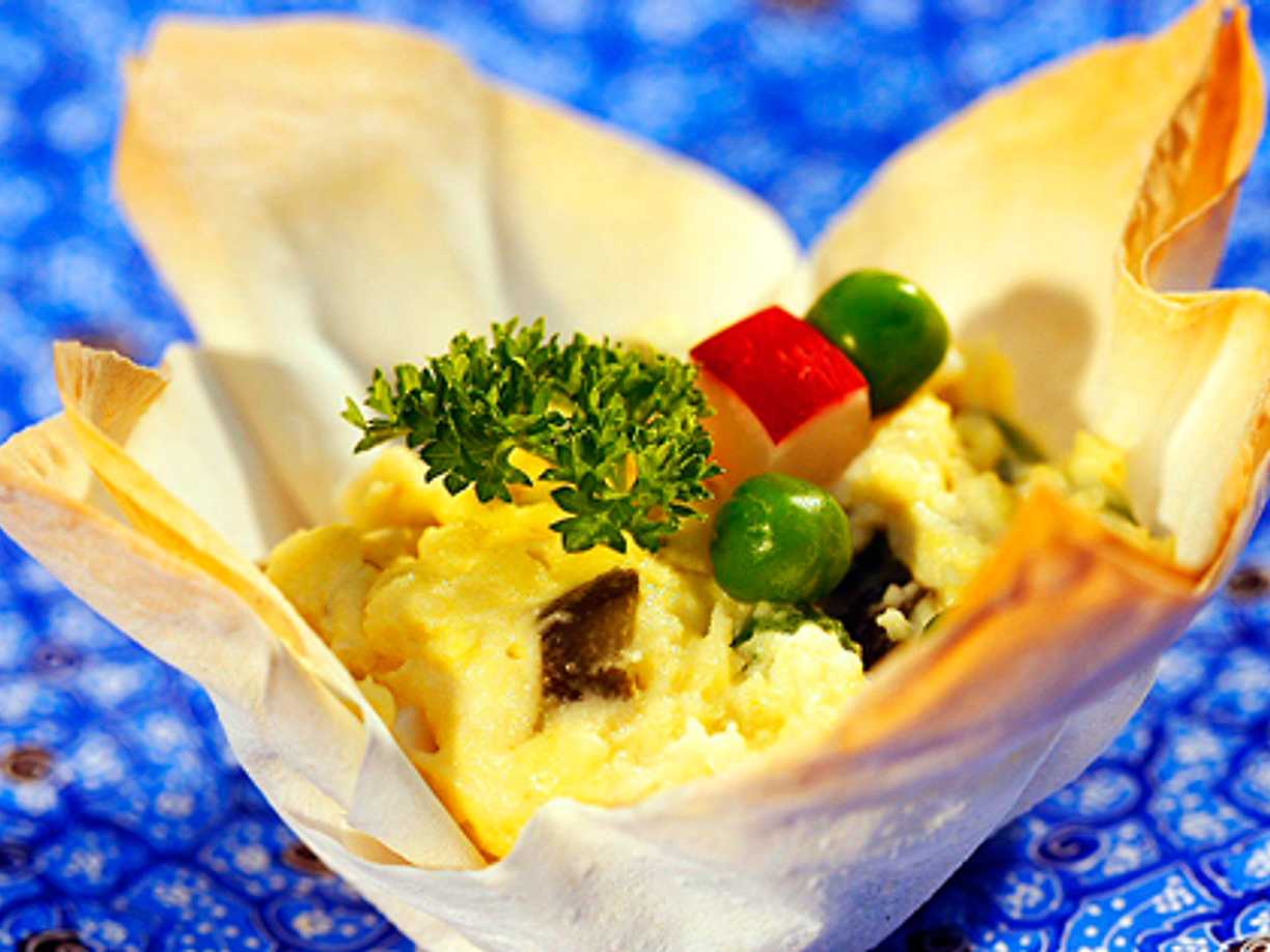 Stekt råka med färsk potatis, gräddsås och ljummen sparrissallad