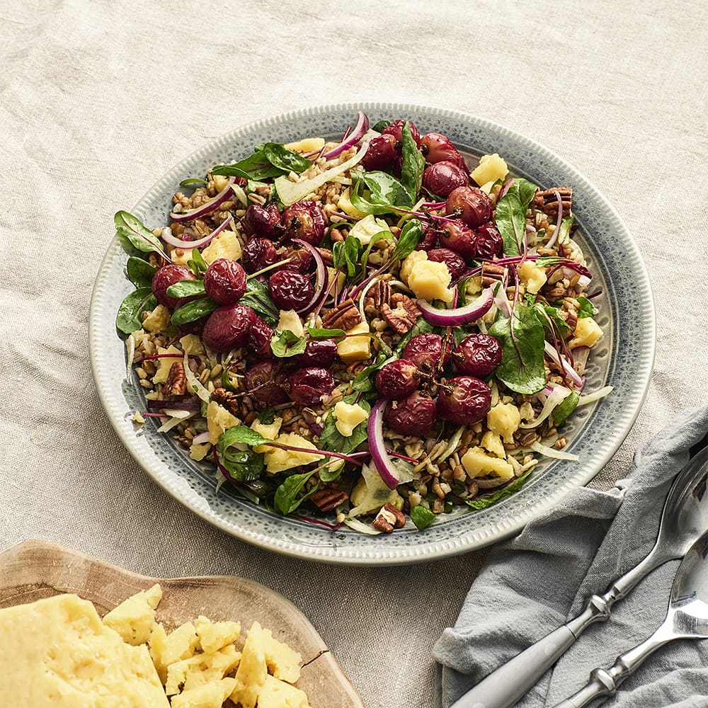 Sallad med kvarngryn, bakade druvor och hårdost