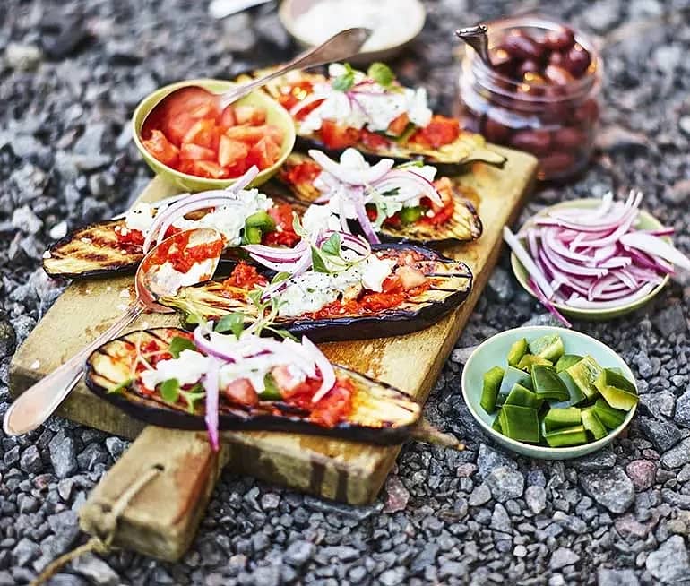 Grillad aubergine med grekisk sallad och tzatziki