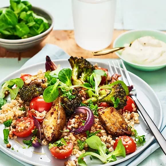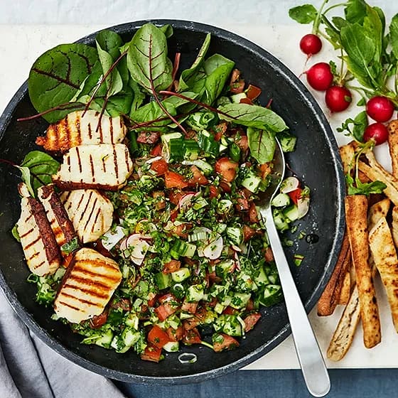 Halloumisallad med kikärtor och grön yoghurtsås