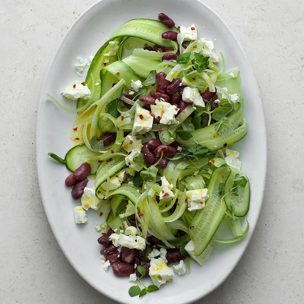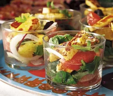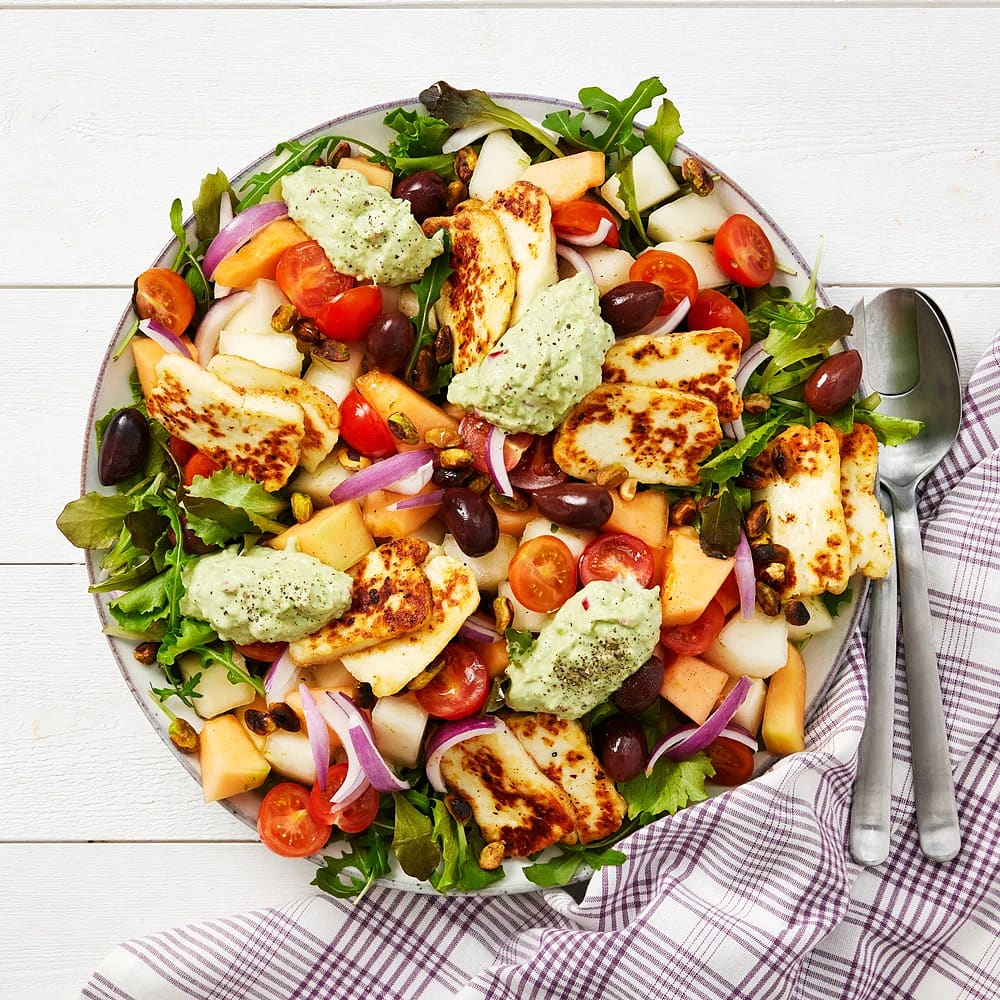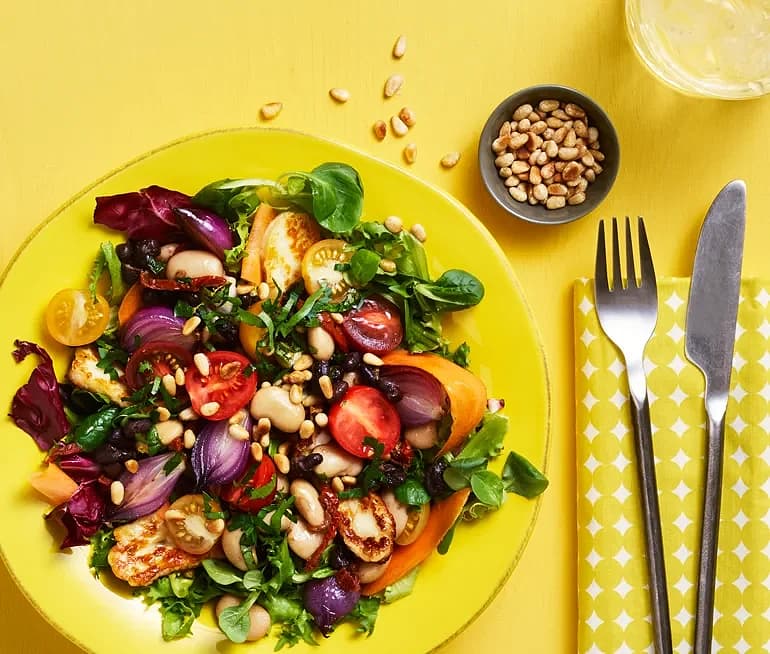 Halloumi- och nektarinsallad med yoghurt och bönor