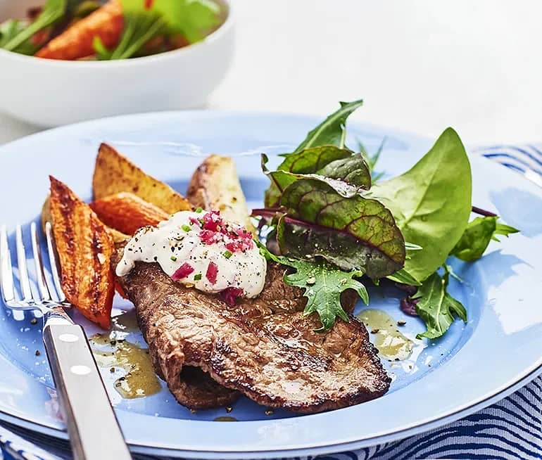 Fläskkotlett med rostad sötpotatis och fetaostsallad
