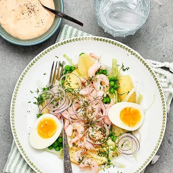 Grönländska räkor med pocherat ägg och marinerad sallad