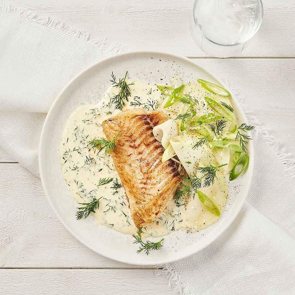 Rödstrimma med kålrabbisallad och pepparrotsgrädde
