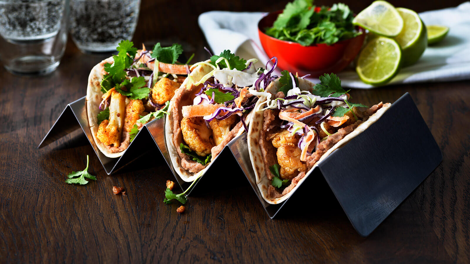 Blomkålstacos med refried beans & krämig coleslaw