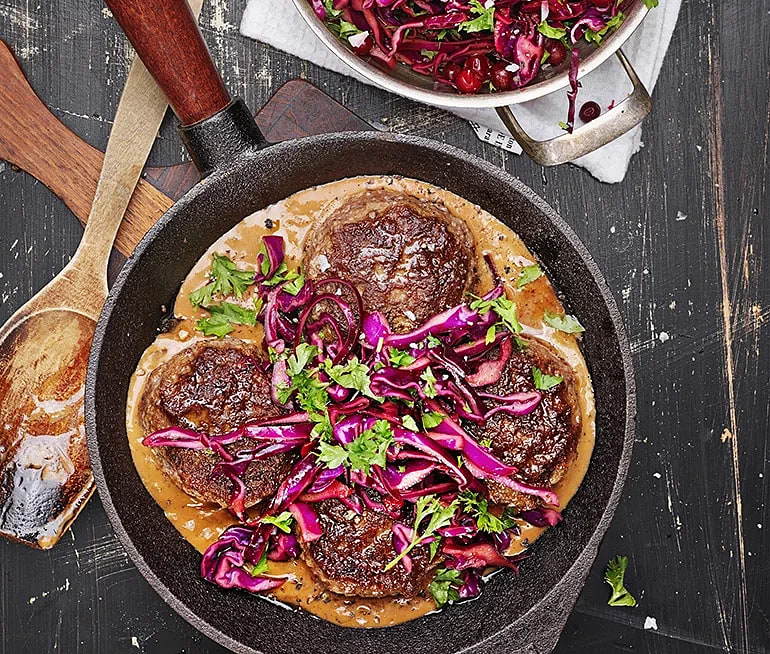 Amirs fläskfärslimpor med coleslaw på rödkål och ingefära