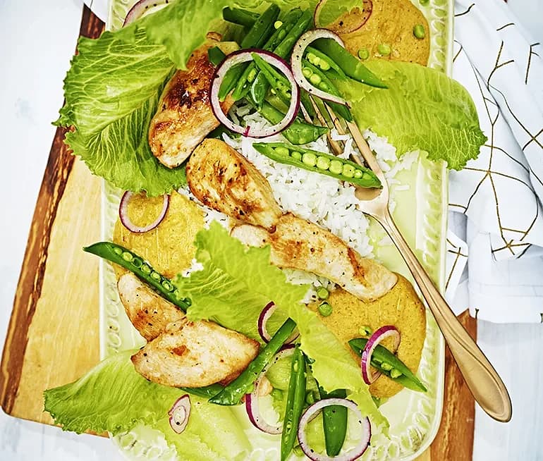 Kyckling med jordnötssås och salladsärter
