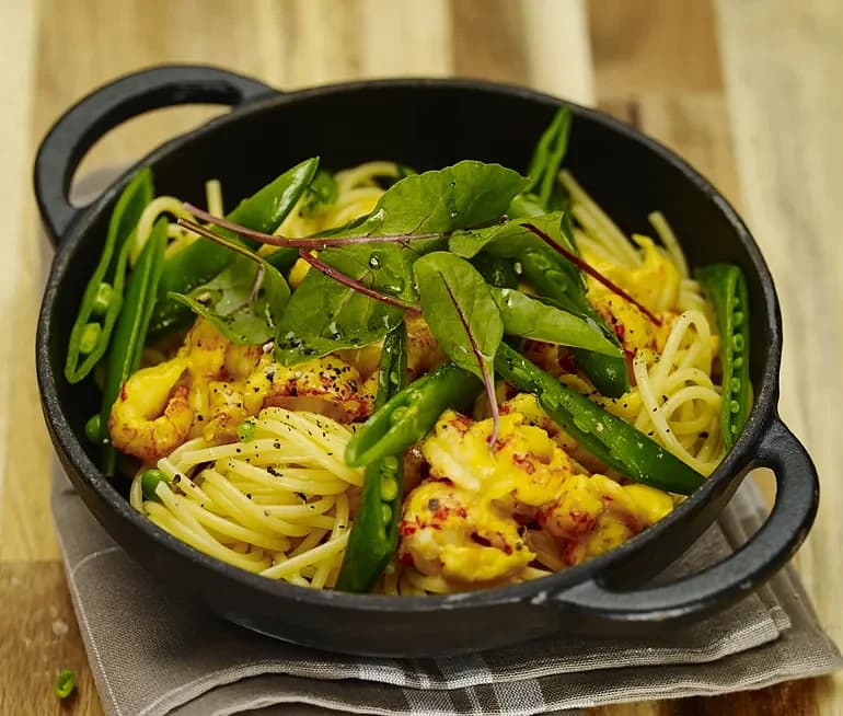 Kräftpasta med saffran och salladsärtor