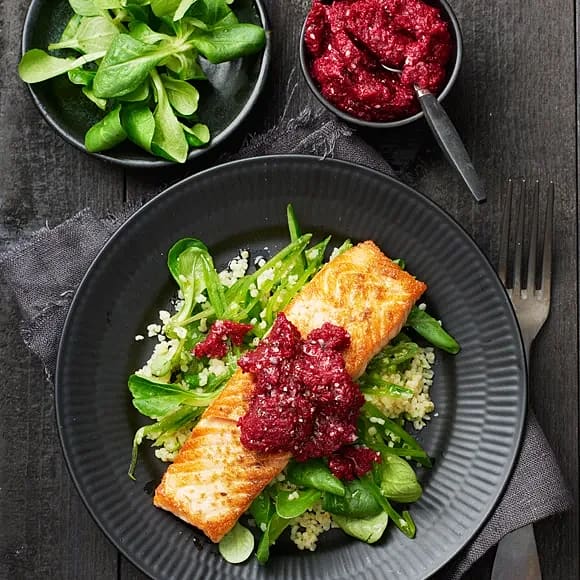 Lax med rödbetshummus och salladsärtor