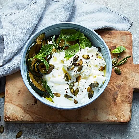 Salt yoghurtskål med vitlöksstekt zucchini