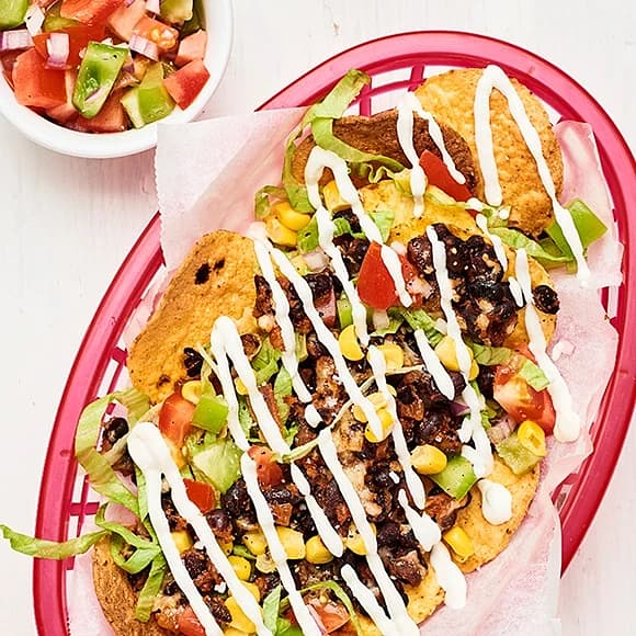 Gratinerade tortillachips med salsa och bönor