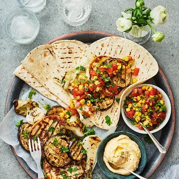 Aubergine- och halloumiburgare med salsa och grillat tortillabröd