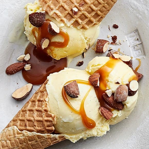 Vaniljglass med salt kolasås och rostad mandel