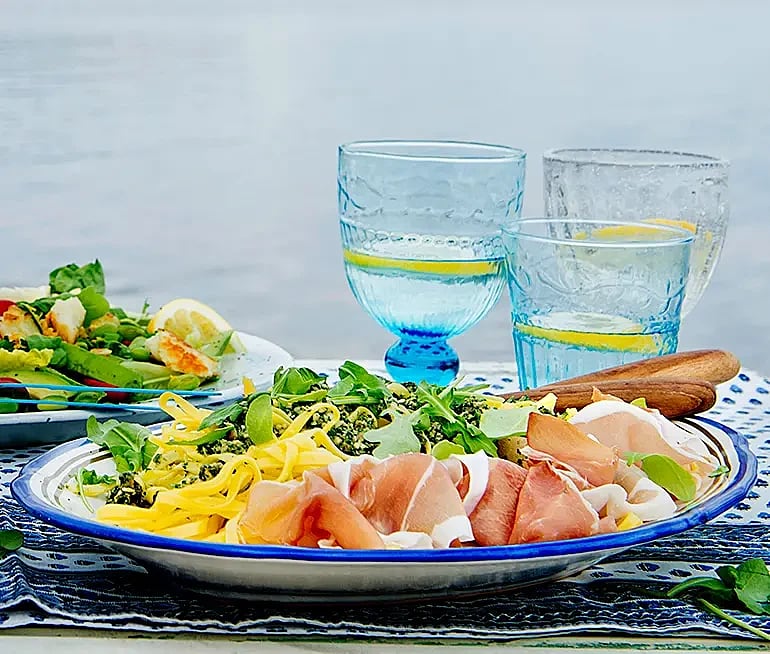 Sommarpasta med salsa verde och lufttorkad skinka