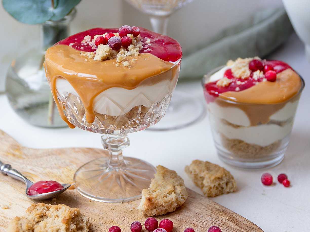 Snabb trifle med lingonsylt och salt kolasås
