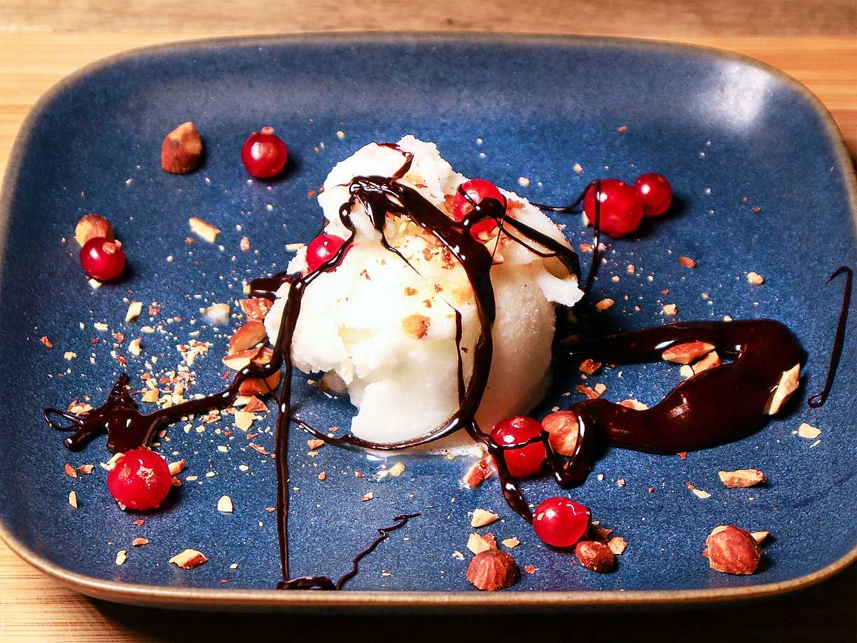 Citronsorbet med salt lakritssås, mandelkross och röda vinbär