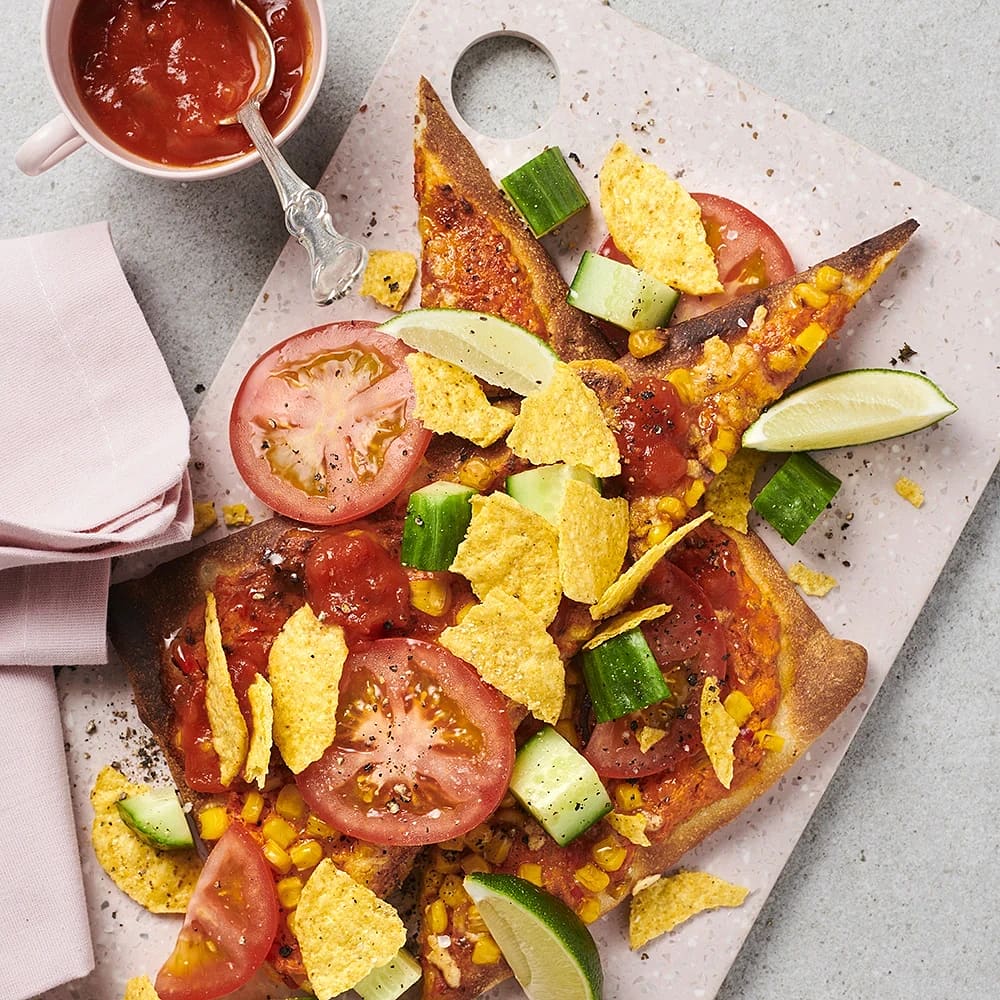 Majspizza med salsa och nachos