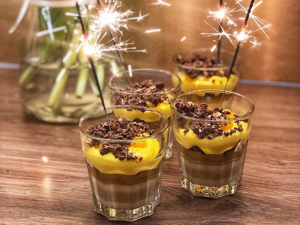 Krämig mjölkchokladbrulée med salt kolasås, syrlig havtornsmousse och chokladkrisp