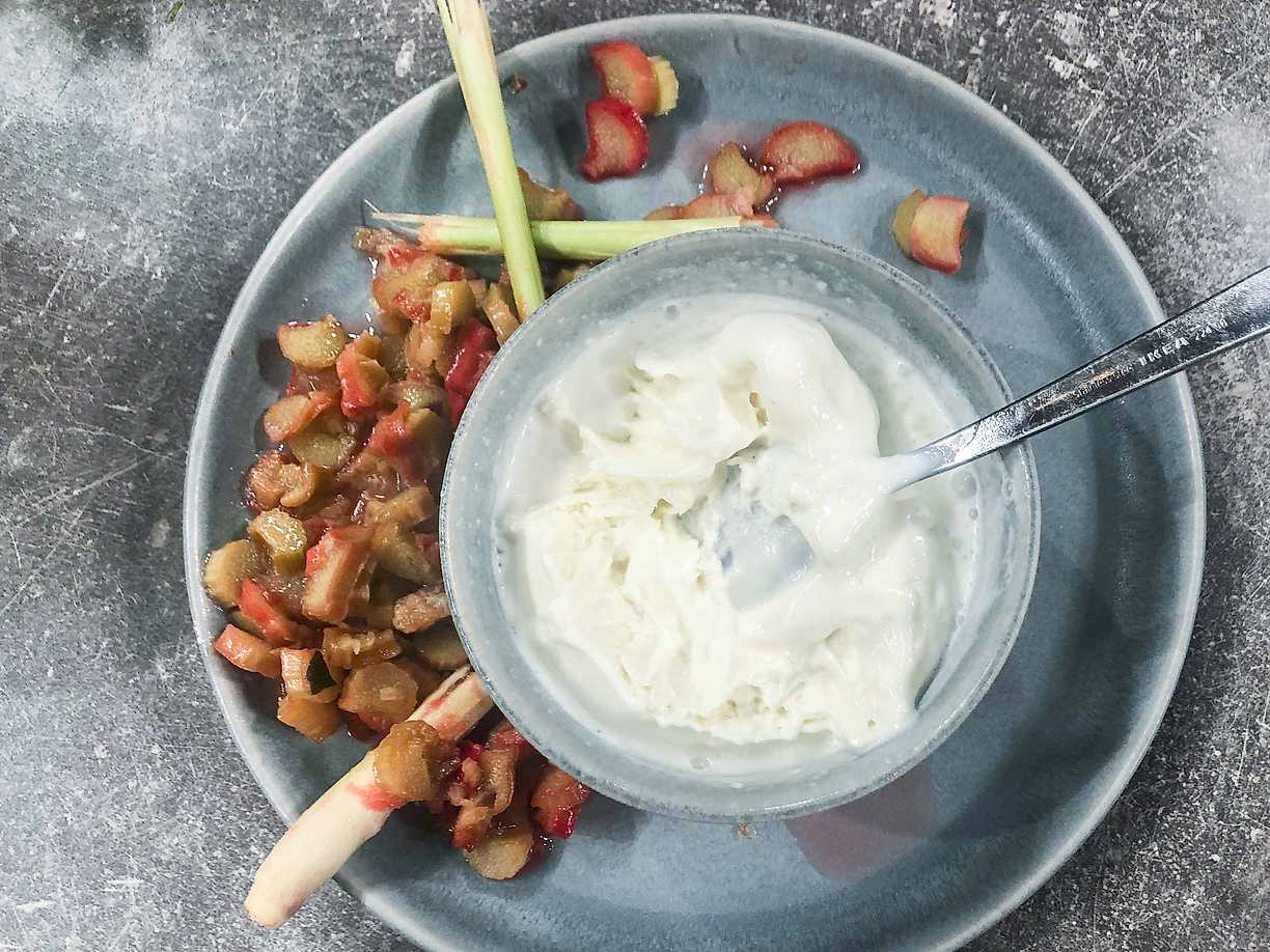 Rabarber bakade med citrongräs och salt kokosglass