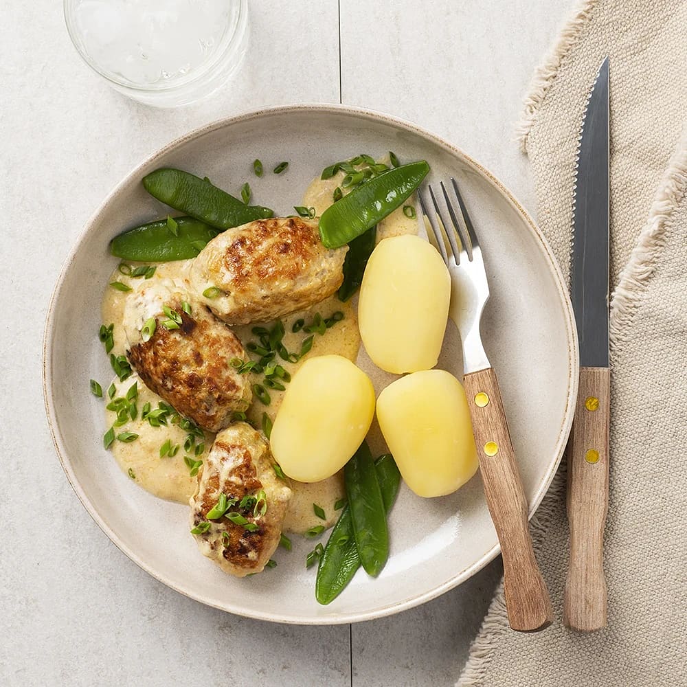 Kycklingrullader med pressad potatis och magisk sås