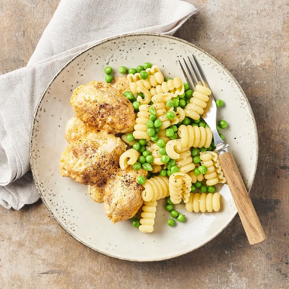 Kycklingjärpar i sås med pasta och ärtor