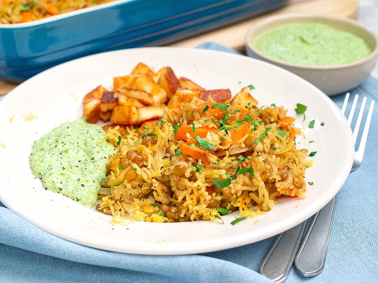 Ugnsbakat ris med grillost och syrlig sås