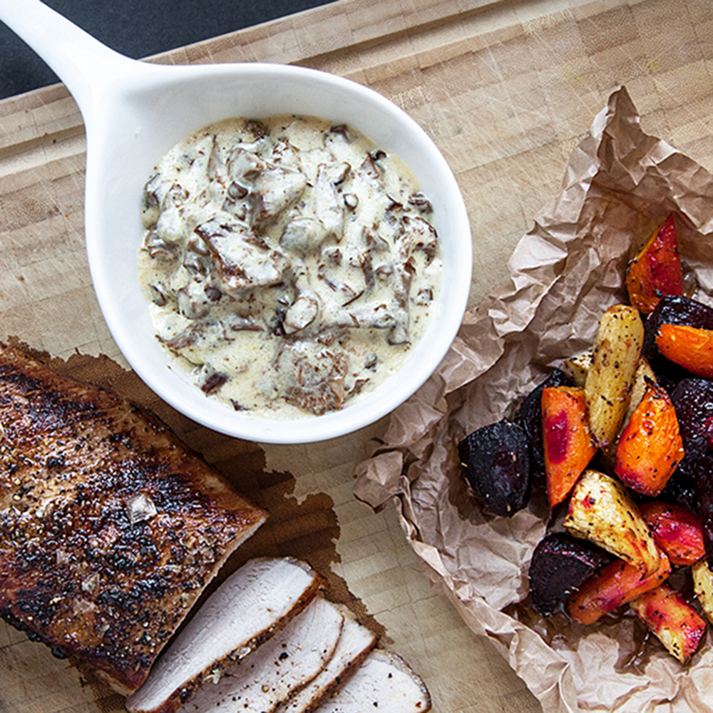 Fläskkotlett med sås på grillad paprika