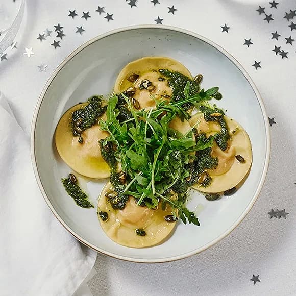 Pumparavioli med fröpesto