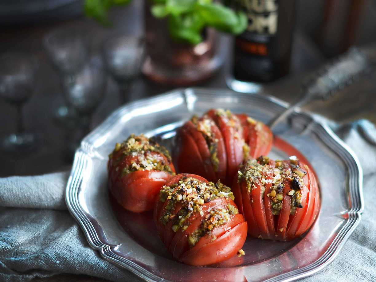 Hasselbackstomater med pesto