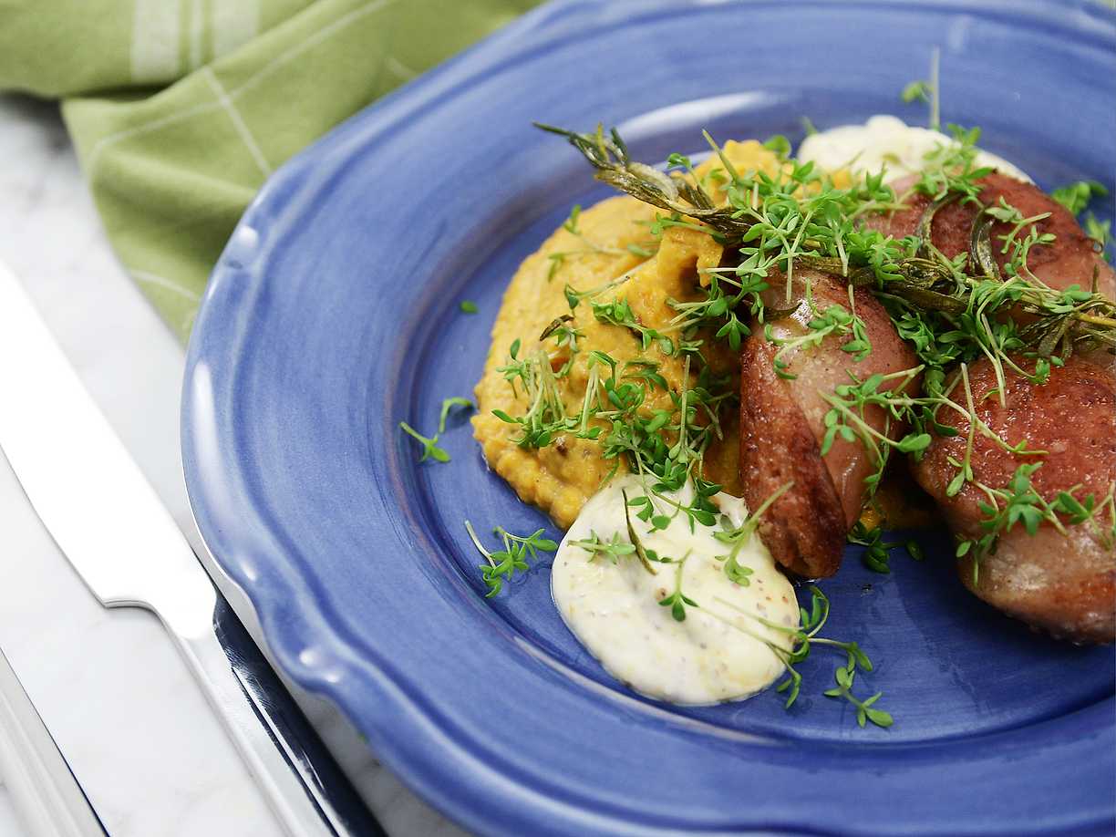 Kokt och stekt fläskkorv med senapskräm och pumpamos