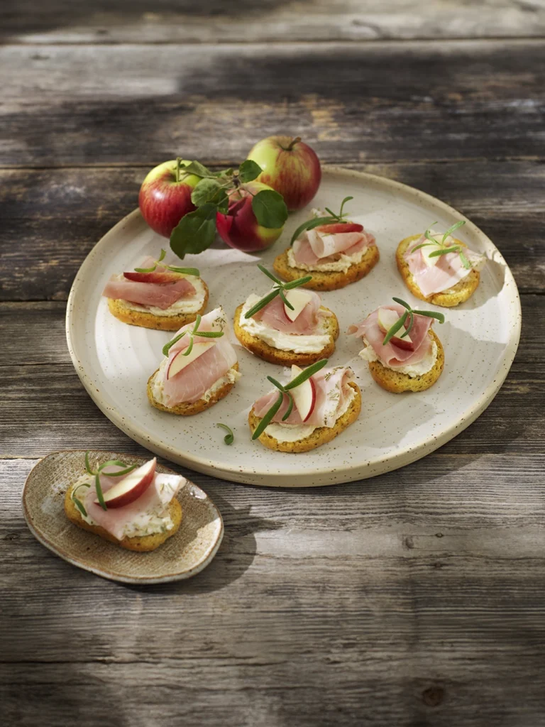 Bruschetta med julprosciutto, senapskräm och äpple