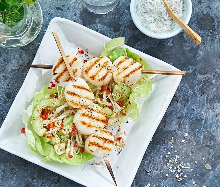 Kammusslor med norimajonnäs och sesammarinerade groddar