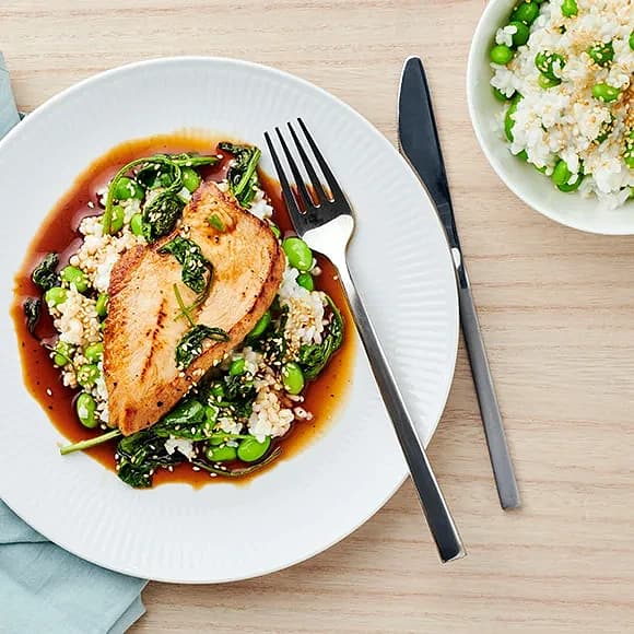 Sötstark kyckling med syrlig vitkålsmajonnäs och sesamris