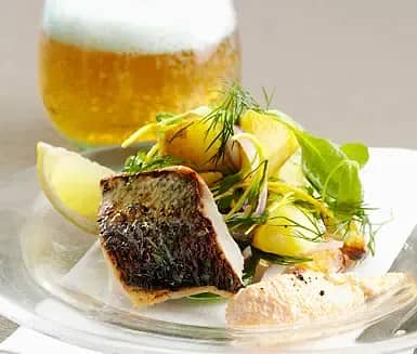 Rökt sik med sauce verte och potatissallad med hasselnöt och salladslök