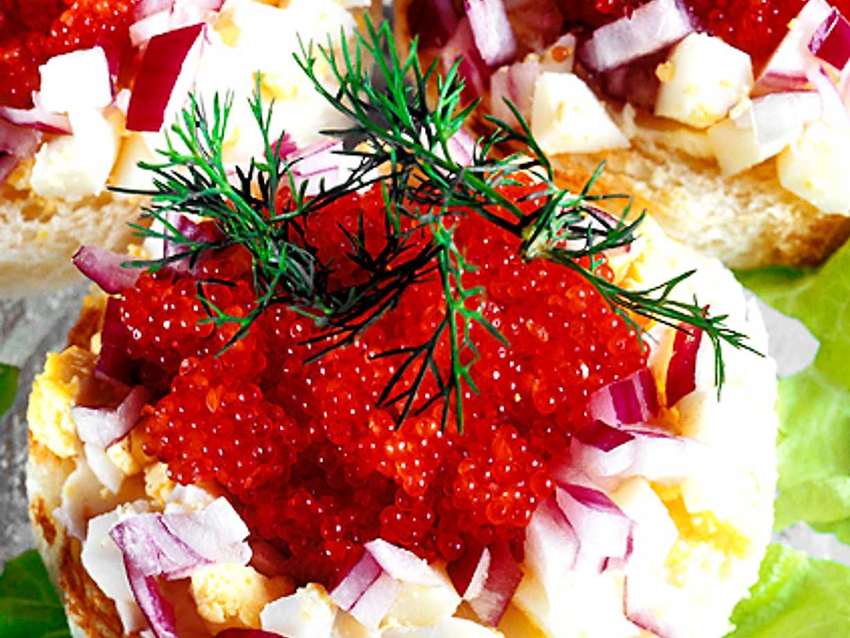 Råraka med löjrom alt sikrom, vispad creme fraiche och rödlök
