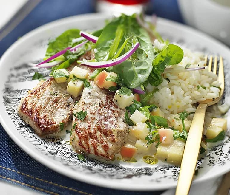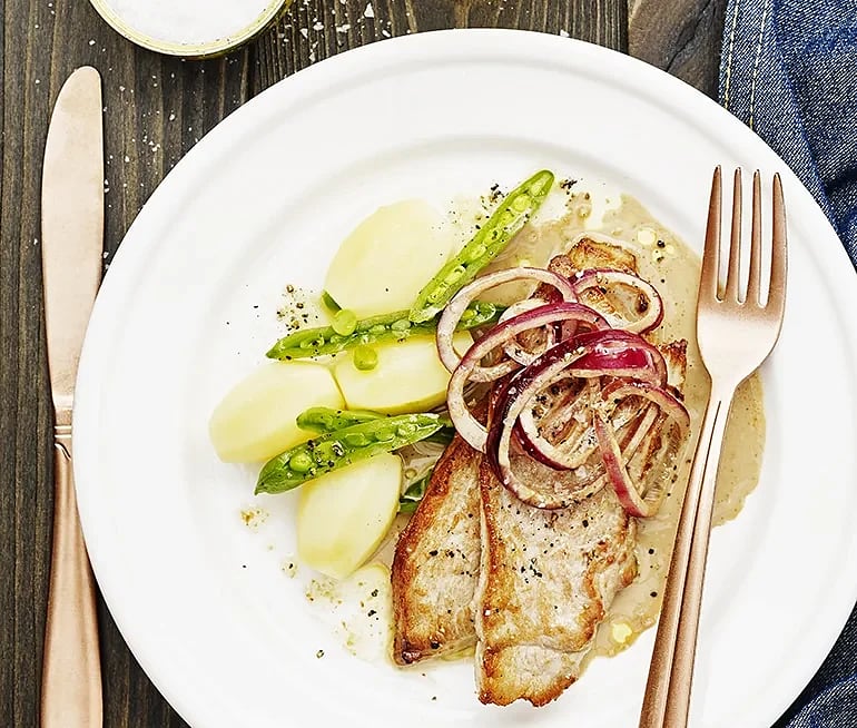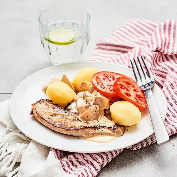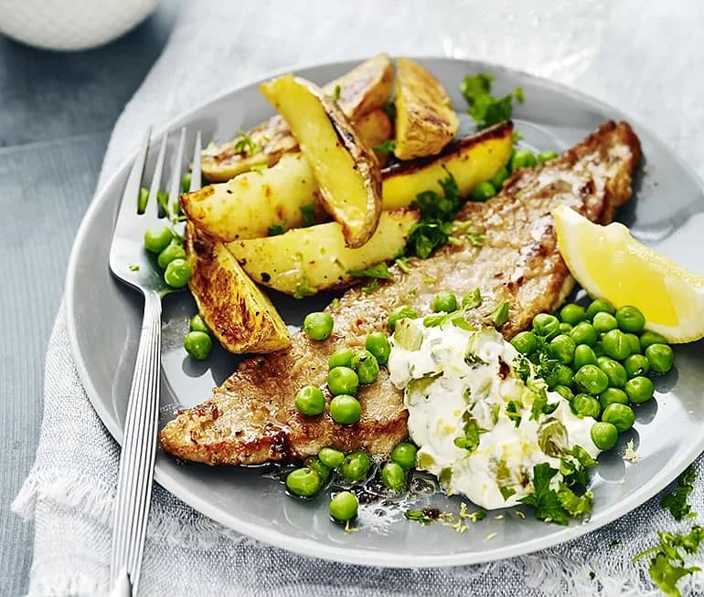 Örtstekt skinkschnitzel med grekisk potatissallad
