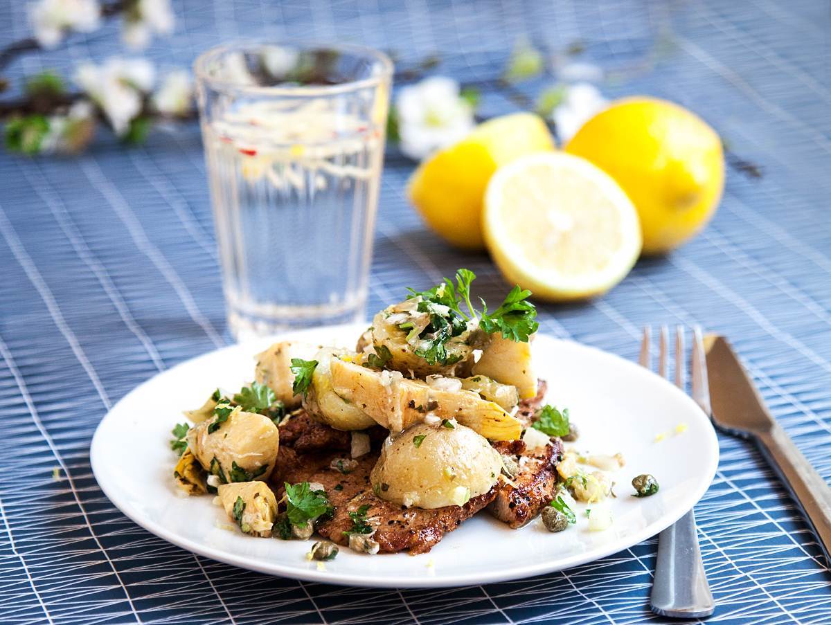 Skinkschnitzel med kronärtskockspotatis