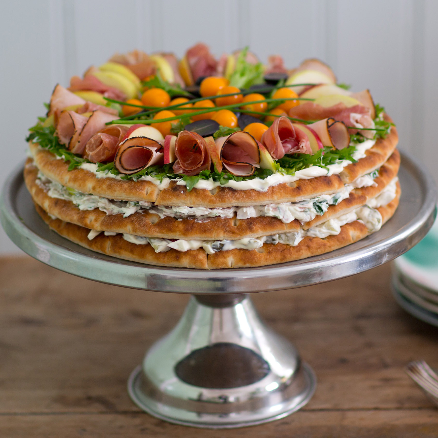 Italiensk smörgåstårta med pesto och soltorkade tomater